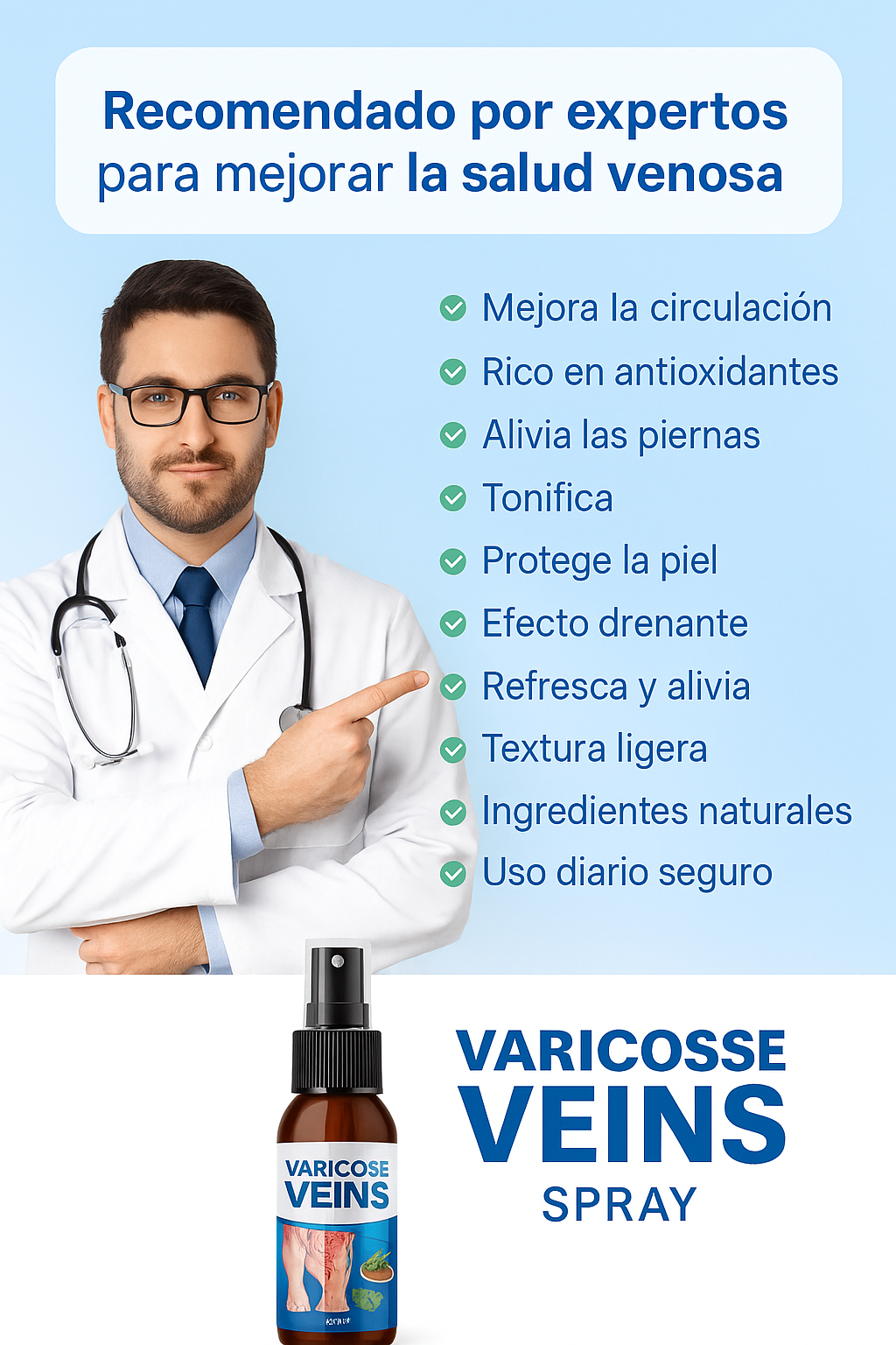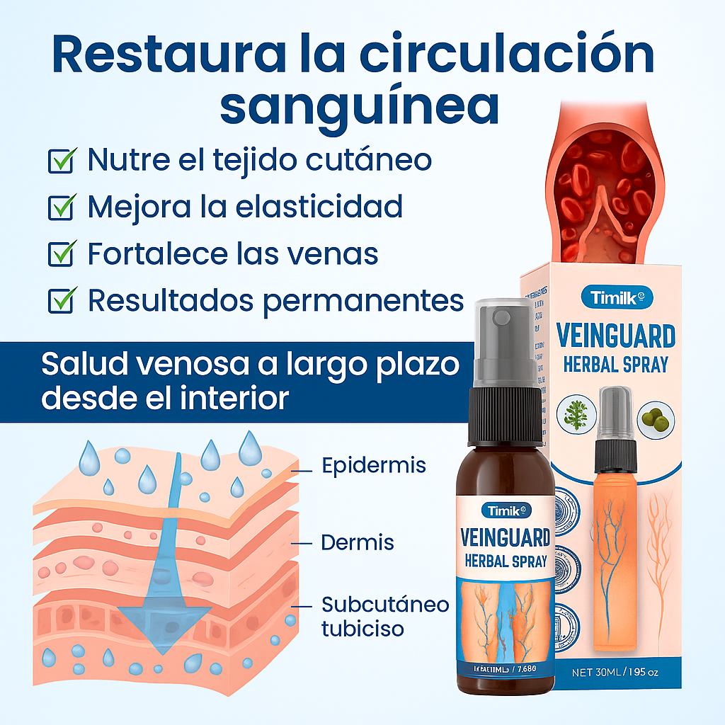 VARICOSE SPRAY™ es un spray de uso tópico diseñado para acompañar el cuidado diario de las piernas, ayudando a mejorar la apariencia de venas visibles y brindando una sensación de alivio y frescura.
