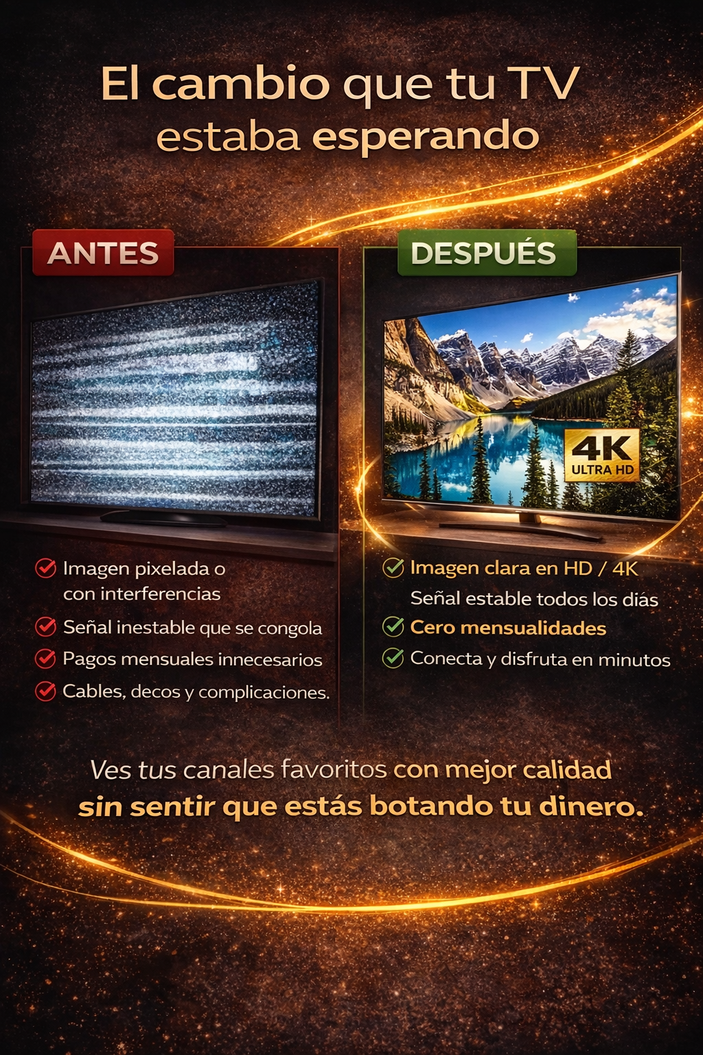 Disfruta canales abiertos en HD y 4K sin pagar mensualidades, sin contratos y sin depender de internet.